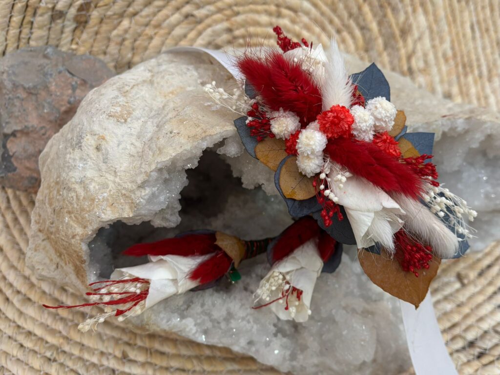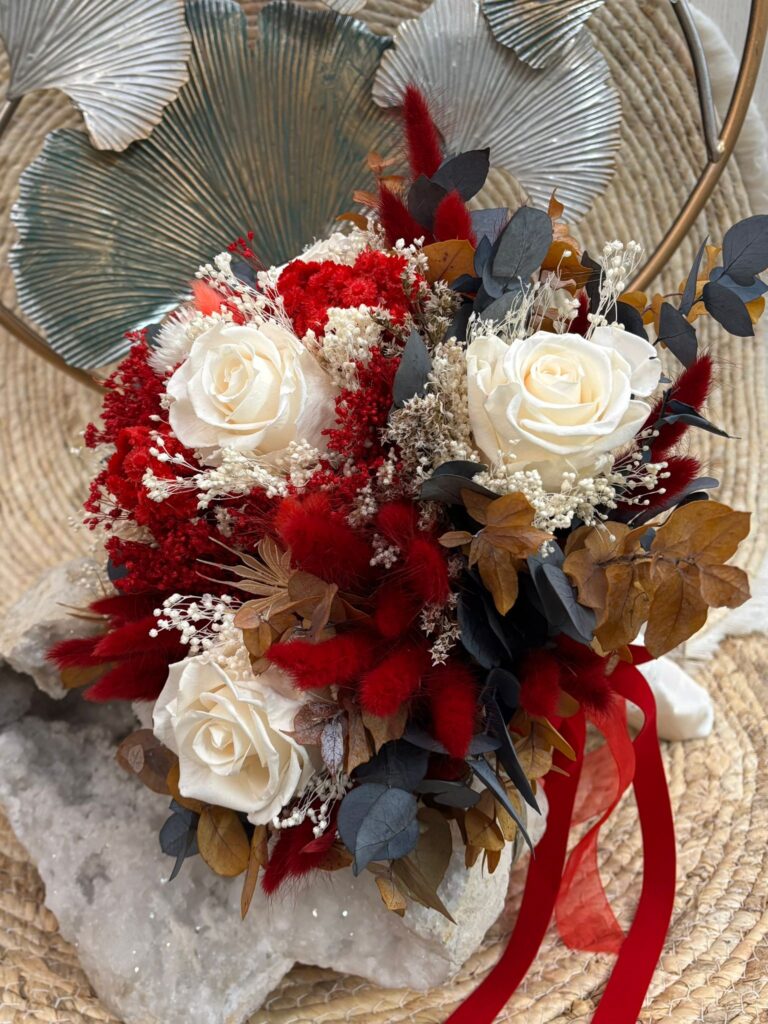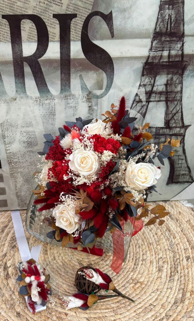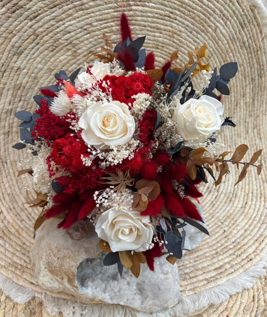 Adriana soñaba con un ramo de flores preservadas de aire silvestre, sencillo y elegante, inspirado en la belleza natural del campo. Quería que el rojo y el blanco se entrelazaran de forma armoniosa, aportando contraste y equilibrio, como un reflejo sutil de su vestido de novia. Un ramo con personalidad, atemporal y lleno de significado, pensado para conservarse en el tiempo como recuerdo de un día único.